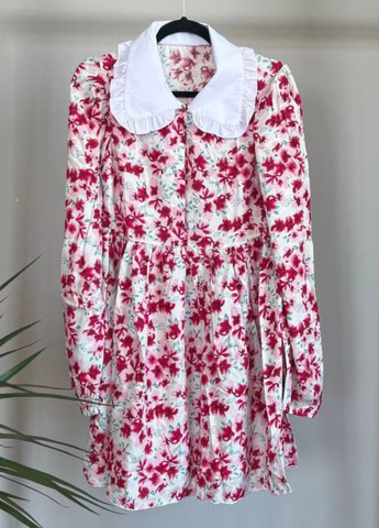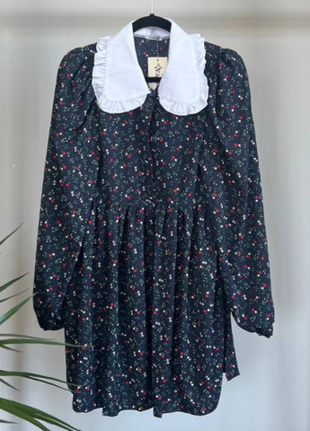 Міні сукня кльош-сонце з квітковим візерунком. Сукня з довгими рукавами ліхтарик. Відкладний комір прикрашений рюшами. Застібується на гудзики. Тканина: софт.