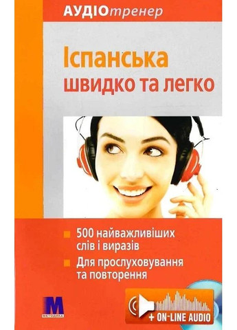 Аудіoтренер «Іспанська швидко та легко» це: * Тренування 500 іспанських слів і виразів, задіяних у найважливіших комунікативних сферах; * Ефективне заучування слів: слухати, повторювати й одночасно контролювати правильність вимови; * Слова практично й наглядно розподілені за темами; * Слова та їхній переклад можна легко проглядати в додатковій книзі; * Ідеальне рішення для тих, хто без великих зусиль хоче розширити свій словниковий запас; * Буде корисним для школярів, студентів, службовців і всіх, хто потребує покращення своїх знань з мови.