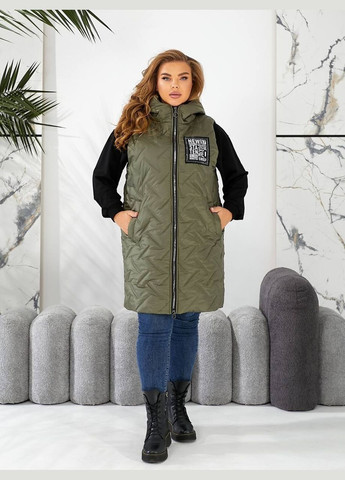 Дизайн: Стильна стьобана жилетка безрукавка для великих розмірів з рукавами до локтя та глибоким капюшоном. Практичні кишені для зручності в холодну пору року.