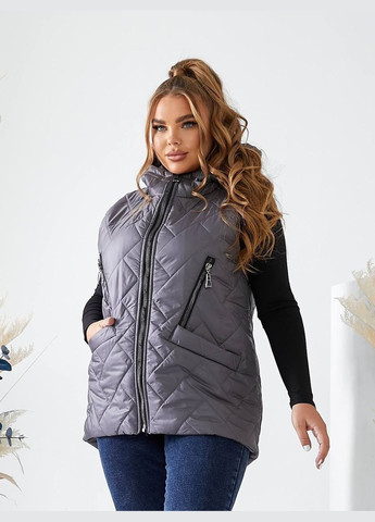 Дизайн: Стильна стьобана жилетка безрукавка для великих розмірів з рукавами до локтя, глибоким капюшоном та практичними кишенями.