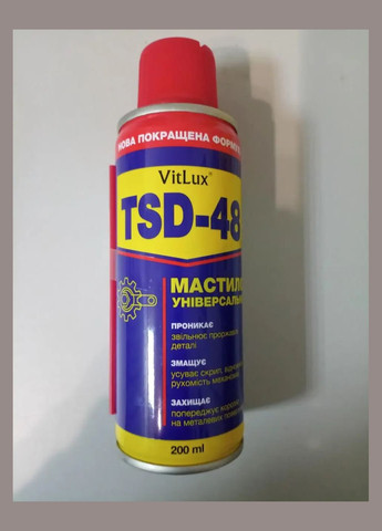 Переваги мастило універсальне VitLux TSD-48: забезпечить надійний захист від іржі у важкодоступних місцях механізму; розчиняє - олію, смолу, клей та ін; НЕ шкодить лакофарбовому покриттю; утворює захисну плівку для запобігання виникненню корозії. Універсальна олія VitLux TSD-48: Повністю безпечна не тільки для металу, але і для гуми, дерева та пластику; прибирає скрип та перешкоджає утворенню іржі; оброблена деталь надійно захищена від попадання частинок пилу та бруду; витісняє вологу, не є провідником електрики. Засіб для видалення клею VitLux TSD-48: легко справляється з виведенням плям від клею як засохлого, так і рідкого; НЕ містить силікон, гас, воду, віск, фреони CFC та інші канцерогенні речовини; абсолютно безпечний при попаданні на шкіру; НЕ залишає жирних чи липких слідів.
