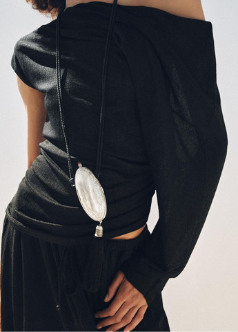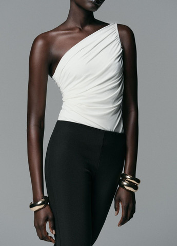 Топ з асиметричним вирізом, коротким та довгим рукавом. Бічні збирання. Асиметричний низ.