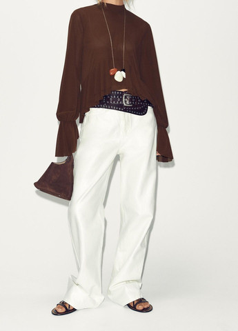 Топ з регульованою горловиною халтер і зав'язки ззаду. Довгі рукави із еластичними манжетами. Розрізи на плечах та волани з тієї ж тканини.