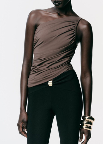 Топ з асиметричним вирізом із тканини в рубчик. Без рукавів, широка бретель із металевою деталлю.