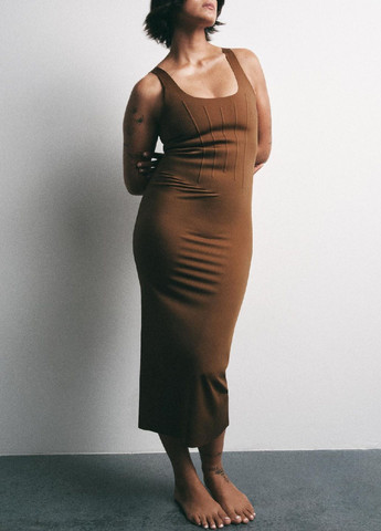 Коригуюча сукня міді з трикотажу з поліамідної суміші. Має круглий виріз горловини, широкі бретелі та прямий поділ зі шлицею ззаду.
