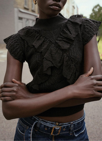 Топ з коміром-стійкою та короткими рукавами. Оздоблення воланами з перфорованою вишивкою в тон.