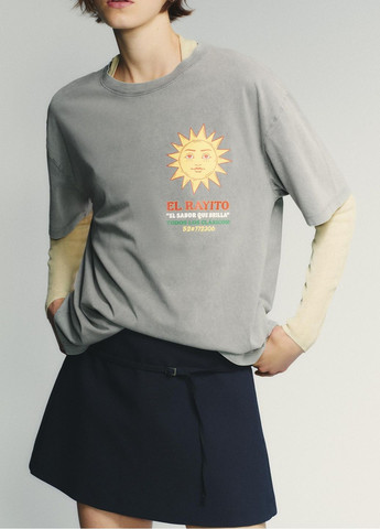 ВІЛЬНИЙ КРІЙ - КРУГЛИЙ ВИРІЗ - СТАНДАРТНА ДОВЖИНА - КОРОТКІ РУКАВА Футболка зі 100% бавовни. Круглий виріз та короткі рукави зі спущеною лінією плеча. Текст та принт.