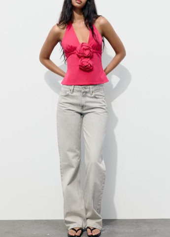 Укорочений лляний топ. Квадратний виріз. Вузькі регульовані бретелі. Квіткова рельєфна аплікація. Еластичні вставки з боків. Застібка-блискавка ззаду.