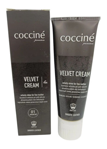 Крем COCCINE VELVET CREAM для делікатних видів шкіри нейтральний 01 75мл Крем COCCINE VELVET CREAM для делікатних видів шкіри нейтральний 01 об'ємом 75 мл — це ідеальне рішення для догляду за вашими улюбленими шкіряними взуттям та аксесуарами. Завдяки сучасній формулі, цей універсальний крем забезпечує дбайливий догляд за благородною та ніжною шкірою, яка потребує особливої уваги. Крем не тільки збільшує еластичність шкіри, але й захищає її, надаючи красивий блиск і оксамитовий вигляд. На відміну від звичайних кремів, COCCINE VELVET CREAM відмінно справляється з делікатними матеріалами, підкреслюючи їх глибину кольору та гладкість. Зручний формат тюбика з аплікатором дозволяє легко і точно наносити крем на взуття, сумки та портфелі, що робить його незамінним помічником у догляді за шкіряними виробами. Крем створює захисний шар з восків і смол, який допомагає зберегти первісний вигляд шкіри та захищає її від несприятливих впливів навколишнього середовища. Для досягнення найкращих результатів перед нанесенням крему рекомендується видалити пил, бруд і раніше використані консерванти. Нанесіть невелику кількість крему за допомогою аплікатора, дайте йому висохнути та відполіруйте до блиску. Після полірування рекомендується просочити взуття водовідштовхувальною пропиткою для додаткового захисту. Крем COCCINE VELVET CREAM підходить для всіх видів шкіри і ідеально підходить для щоденного догляду, відновлення кольору та надання блиску. Він не містить агресивних хімічних добавок, що робить його безпечним для використання. Обираючи COCCINE VELVET CREAM, ви забезпечуєте своїй шкірі надійний догляд та довговічність, зберігаючи її красу на тривалий час. Цей продукт стане відмінним вибором для тих, хто цінує якість і хоче продовжити життя своїм шкіряним виробам. Зробіть крок до ідеального догляду за шкірою з COCCINE VELVET CREAM і насолоджуйтесь бездоганним виглядом вашого взуття та аксесуарів.