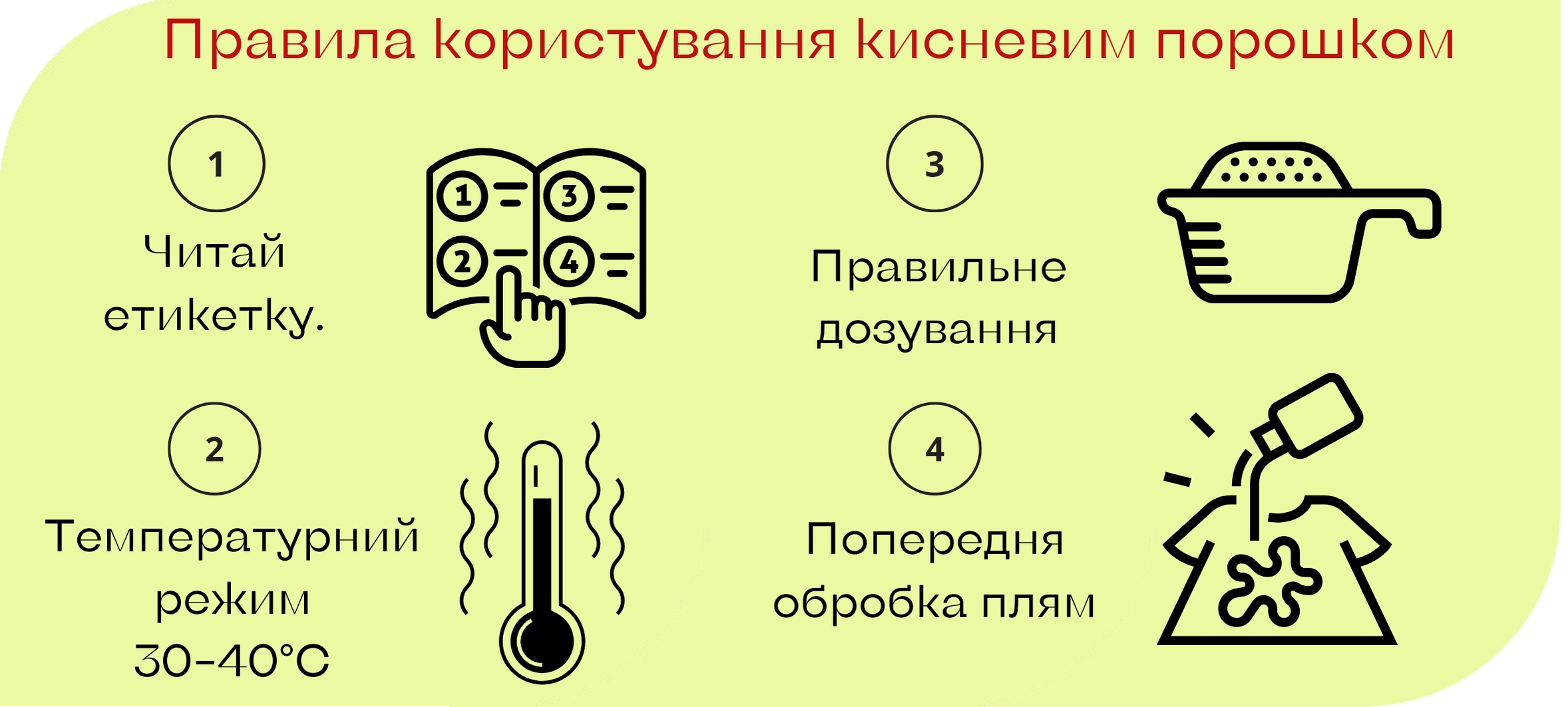 - Кисневий порошок: використовуйте мінімальну дозу порошку і уникайте замочування. Кисневий порошок дозволяє зберегти насиченість кольорів, не впливаючи на їхню яскравість.
