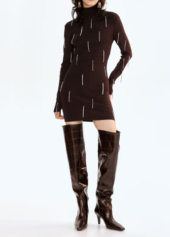 Коротка сукня з щільної трикотажної тканини. Водолазка і довгі рукави, що облягають, прикрашені ланцюжками з блискучих стразів, які утворюють бахрому спереду і на рукавах.