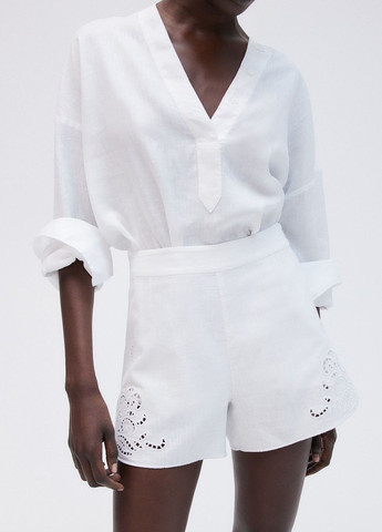 Шорти з льону та віскози з англійською вишивкою. Висока талія, потайна застібка-блискавка та застібка на гачок з одного боку.