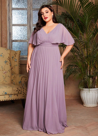 Ця сукня plus-size має V-подібний виріз і шифоновий дизайн, що струмує. Вона включає плісовані розкльошені рукави з подолом у вигляді сонця. Сукня має стандартний крій та застібається на блискавку. Тканина не тягнеться.