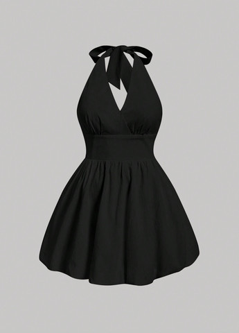 Ця сукня має улесливу високу талію і розкльошений поділ. Вона має дизайн без спинки з халтер-коміром та деталлю з вузлом. Сукня виготовлена з нееластичної тканини та забезпечує приталений крій.