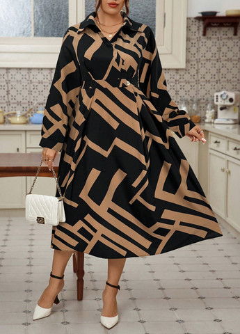 Ця сукня-сорочка plus-size має випадковий принт тай-дай. Вона призначена для носіння навесні та восени. Сукня має стандартний крій з коміром-стійкою та високою талією. Вона включає застібки на ґудзики та оборчастий поділ. Рукави в стилі єпископа, поділ - оборка. Тканина не тягнеться.