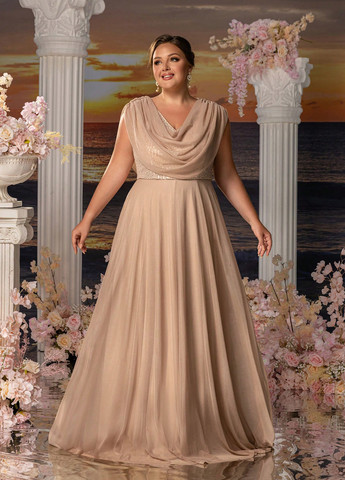 Матеріал Поліестер / Колір Бежевий / Фасон Кльош, Зі шлейфом, А-силует / Довжина виробу Максі / Стиль Святковий, Вечірній