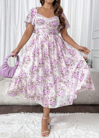 Це сукня з квітковим принтом та відкритими плечима. У нього квадратний виріз та рукави-волани. Сукня має високу талію та збірне оздоблення. Тканина не тягнеться, поділ оборчастий. Це стандартний крій. Кишені не включені.