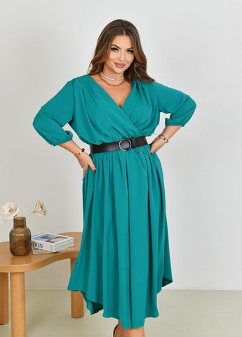 Сукня виготовлена з однотонного шовк-сатину Nikol який має гладку фактуру та трикотажної підкладки. Тканина не має еластичності, враховуйте це під час підбору розміру. Завдяки своєму вільному фасону гарно сідає по фігурі. Сукня з довгими рукавами фасону ліхтарики на вільних манжетах, плечовий шов знаходиться на природній лінії плеча. Сукня має глибокий V-подібний виріз декольте з імітацією запаха та дзеркальний V-подібний виріз на спині з фіксуючим шнурком біля шиї. Тканина зібрана від плечей у м’які складки, що плавно спадають до відрізної талії з вшитою гумкою, нижня частина продовжується такими ж збірками до подолу. В комплекті до сукні присутній ремінь зі штучної шкіри. 52 р-р: ОГ 104, ОТ 80, ОС 116, довжина сукні 125, довжина рукава 41; 54 р-р: ОГ 108, ОТ 84, ОС 120, довжина сукні 125, довжина рукава 41; 56 р-р: ОГ 112, ОТ 88, ОС 124, довжина сукні 125, довжина рукава 42; 58 р-р: ОГ 116, ОТ 92, ОС 128, довжина сукні 125, довжина рукава 42; 60 р-р: ОГ 120, ОТ 96, ОС 132, довжина сукні 125, довжина рукава 43; Виміри робились по верхній частині готового виробу. ОГ — об'єм грудей. ОТ — об'єм талії. ОС — об'єм стегон.