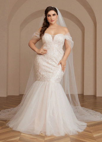 Ця весільна сукня великих розмірів має дизайн із відкритими плечима, посадку без рукавів та максимальну довжину. Виготовлено з тканого матеріалу, має простий малюнок та правильну посадку. Сукня включає контрастні сітчасті деталі та дизайн з відкритою спиною, що створює розкішний образ.