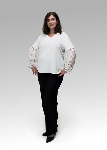 Блуза прямого крою (креп-шовк) з відкладним коміром, V-подібний виріз. Рукав довгий, зі спущеною лінією плеча – «родзинка виробу», декорований мереживним манжетом та мереживною ставкою на рукаві, що надає Вашому образу урочистості та звабливості. Колір білий. Довжина виробу зі спинки 75 см. Довжина рукава 63 см. Зріст моделі на фото 172 см. Розмір моделі 56. Країна виробництва: Туреччина. Бренд: Modalinda