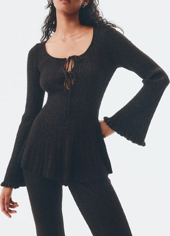 Розкльошений светр з трикотажної тканини в рубчик з довгими рукавами і нитками, що переливаються. Глибокий круглий виріз, спереду дві пари вузьких зав'язок, рукави-труби з оборкою.