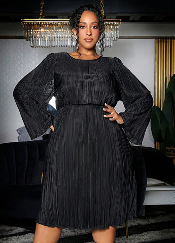 Сукня середньої довжини, з високою талією із трикотажу з невеликою еластичністю. Розкльошений рукав, плісировану тканину.