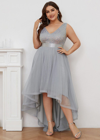 Елегантна сукня великих розмірів з високим і низьким подолом. Відрізняється контрастними паєтками та V-подібним вирізом. Виготовлена з легкого шифону, що злегка тягнеться.