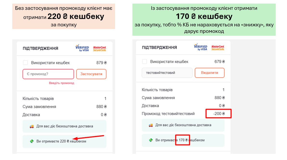 Якщо використовує під час оплати замовлення промокод/бонус, то % кешбеку нараховується на залишкову суму до сплати (це не стосується застосованого кешбеку. Він не зменшує базу для нарахування).