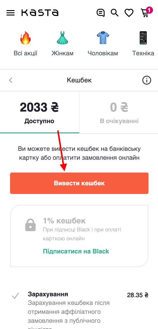 Так, на Kasta ти можеш не тільки використати кешбек для покупок, але й перекинути його на банківську картку, адже у кожного з нас бувають ситуації, коли краще “взяти грошима”.