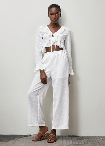 Жіночий костюм Lumivelle з рукавами-дзвіночками та оздобленням рюшами. Цей повсякденний комплект з двох предметів складається з білої блузки та штанів. Штани подовженої довжини на підкладці. Комплект доповнений оборкою внизу та асиметричними деталями. Догляд: прання машини або професійна хімчистка.