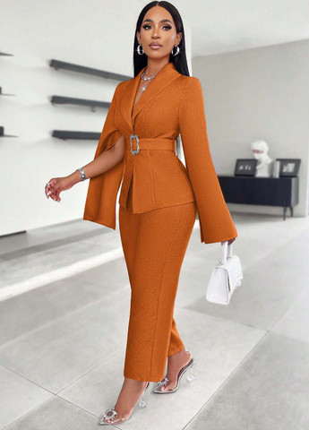 Костюм з жакету та штанів. Цей костюм підійде для ділових та щоденних поїздок. Він призначений для весняного та осіннього сезонів. Він має стандартний крій з розрізом та поясом. Тканина не тягнеться.