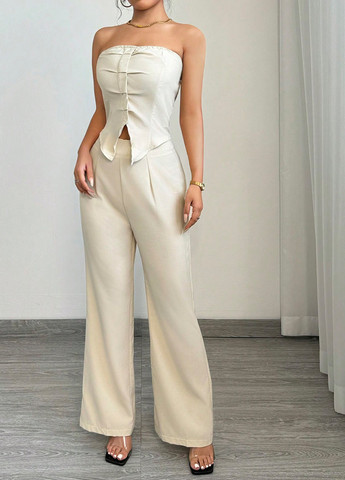 Жіночий відпускний комплект складається з топу та штанів. Верх має асиметричний низ, виріз без бретелів та застібку-блискавку. Він виконаний із напівпрозорої тканини з невеликим розтягуванням. Штани мають звужений крій.