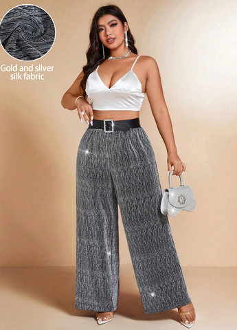 Жіночий костюм з блискучої тканини, блейзер і штани. Цей костюм має вільний крій. Він включає виріз з лацканами і вшиті рукави. Костюм включає кишені та ґудзики. Тканина не тягнеться.