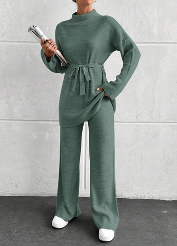 Цей комплект з двох трикотажних виробів складається з однотонного светра з довгими рукавами та відповідних штанів. Він має стандартний крій з коміром-стійкою та поясом. Виріб має розрізний дизайн. Тканина трохи тягнеться для комфорту. Кишень немає.