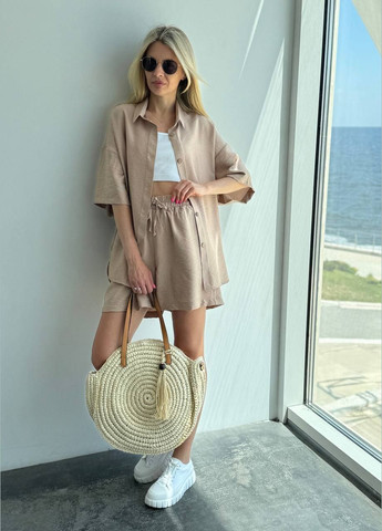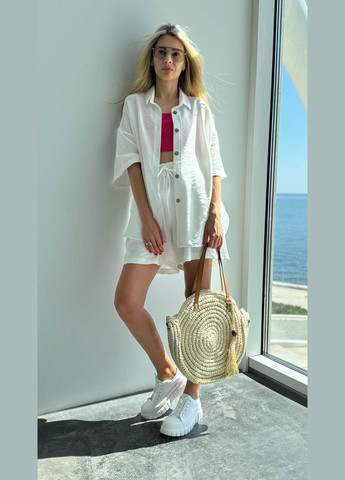 Неймовірно стильний жіночий костюм. Сорочка подовжена, по бокам розрізи, плечовий шов спущений, рукав короткий. Шорти вільного крою, пояс на резинці, висока посадка, є бокові кишені. Ці речі можна стильно та сучасно поєднувати з іншими елементами вашого гардеробу. Однією з вагомих переваг льон жатки є її легкість, м'якість і приємний зовнішній вигляд. Тканина легко відновлює форму, та не потребує прасування, що робить її зручною в використанні. Тканина: льон жатка Розмір: 42-44, 46-48, 50-52