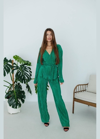 Жіночий костюм, що складається з кофти на запах і плісованих штанів з підкладкою, є стильним і сучасним рішенням для модних і впевнених у собі жінок. Кофта на запах: Цей елемент костюма виконаний у крої "на запах", який забезпечує зручну та регульовану посадку. Кофта елегантно охоплює фігуру, створюючи жіночний силует та підкреслюючи талію. Довгі рукави додають образу вишуканості, а м'який матеріал забезпечує комфорт та приємні відчуття при носінні. Штани пліссе з підкладкою: Штани виконані в техніці плісе, що надає їм особливої ​​текстури та об'єму. Плісовані складки створюють динамічний і елегантний силует, що вільно струмує при кожному кроці. Підкладка, зроблена з м'якого та дихаючого матеріалу, забезпечує додатковий комфорт та приховує можливу прозорість тканини, гарантуючи впевненість та зручність протягом усього дня. Цей костюм ідеально підходить для різноманітних заходів – від ділових зустрічей до вечірніх прогулянок. Кофта на запах та плісовані штани з підкладкою створюють гармонійний та стильний ансамбль, який підкреслює індивідуальність та витончений смак своєї власниці. Тканина плісе + підкладка Розмір 42-44, 46-48