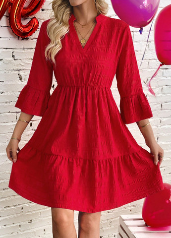 Коротка сукня – Emery Rose. Це червона сукня з вирізом та розкльошеними рукавами. Вона має високу талію та оздоблення воланами. Тканина не тягнеться, поділ оборчастий. Класичний крій.