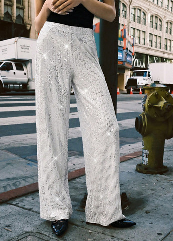 Ці мерехтливі сріблясті штани з паєтками пропонують модний стиль для вечірки. Вони мають стандартний крій та високу талію. Штани включають еластичну застібку на талії та розкльошений поділ. Також передбачено застібку на гудзики. Тканина не тягнеться.