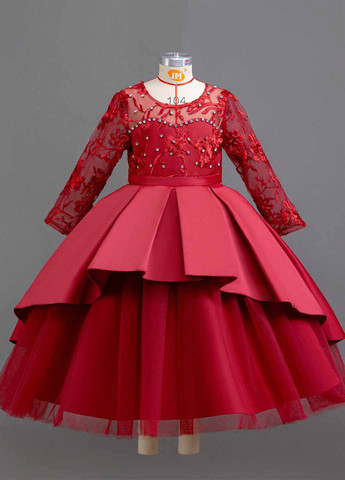 Дитяча різдвяна сукня Glamorique. Ця сукня підходить для маленьких дівчаток. Сукня прикрашена червоним мереживом. Круглий виріз та довгі рукави. Сукня виконана в бальному стилі з високою талією, облягаюча та розкльошена. Тільки ручне прання.