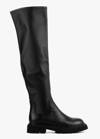Чорні ботфорти єврозима. Низ виготовлений з натуральної шкіри, верх - з еластичного стрейчу. Всередині утеплені хутром з 40% вмістом вовни. Збоку розташована укорочена блискавка. Висота від п'яти становить 60 см. Підошва: спереду - 2,5 см, ззаду - 4 см. Виробництво: Україна (Харків).