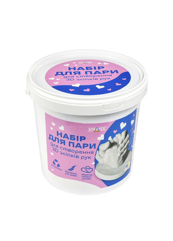 Набір для творчості Strateg: створення 3D сліпка рук для пари Набір для створення об'ємного сліпка рук — це унікальна можливість зафіксувати теплі почуття у вигляді тривимірної фігурки. Такий сліпок стане символом близькості, довіри та взаєморозуміння між двома людьми. Що входить до комплекту: Пластикове відерце-упаковка для замішування матеріалу; Гіпс високої якості для формування сліпка; Гелева суміш, що забезпечує точне відтворення деталей; Дерев’яні зубочистки — 2 штуки для зручного нанесення і роботи з матеріалом; Одноразові поліетиленові рукавички — 1 пара для збереження чистоти під час роботи; Інструкція з докладними кроками для створення сліпка; Спеціальний скат для захисту робочої поверхні. Переваги набору для створення 3D сліпка: Простота у використанні. Після уважного ознайомлення з інструкцією процес створення сліпка не викличе труднощів навіть у новачків. Якість матеріалів. Гіпс і гелева суміш забезпечують чітке та довговічне відтворення форми рук. Безпека. Всі елементи набору безпечні для використання, а рукавички допомагають уникнути забруднень. Оригінальний подарунок. Результат творчості стане унікальним сувеніром, який збережеться на довгі роки. Розмір готового сліпка: висота – 18 см, довжина – 17,5 см. Цей набір відкриває можливість створити справжній об’ємний витвір мистецтва, який відображає особливі емоції та зв’язок між двома людьми. Процес роботи захоплює і дозволяє провести час разом, отримуючи незабутні враження. Важливо!! Надсилає кілька товарів не завжди з одного складаного ножа. Ваше замовлення може бути відправлене з різних міст, якщо необхідні позиції розміщені на різних складах. Відсилання однієї посилкою можливе тільки в тому разі, якщо всі заведені товари є в наявності на одному складі. Якщо ваше замовлення буде відправлене декількома посилками, наш менеджер обов'язково повідомить вам про це під час підтвердження замовлення телефоном. Цей товар є на складі: Склад іграшок No4 Характеристики, комплектація, вигляд і колір товару можуть змінюватися виробником без повідомлення. Магазин не несе відповідальності за такі зміни.