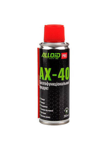 [CDATA[Мастило проникаюче універсальне "АХ-40" ALLOID PRO це високоефективний засіб для змащування, розблокування та захисту від корозії. Завдяки своїй проникаючій здатності, воно ідеально підходить для усунення іржі, змащування механізмів та захисту від вологи. Рекомендації щодо застосування: Обов'язково розмішати вміст балона, струшуючи його не менше 2-ох min (хвилин); Очистити поверхню, що обробляється; Розпилити на поверхню, що обробляється на відстані 10-20 cm (см); Дати ввібратися протягом 3-5 min (хвилин); За необхідності повторити. ВАЖЛИВО! Не застосовувати надмірних зусиль при відкручуванні.]]