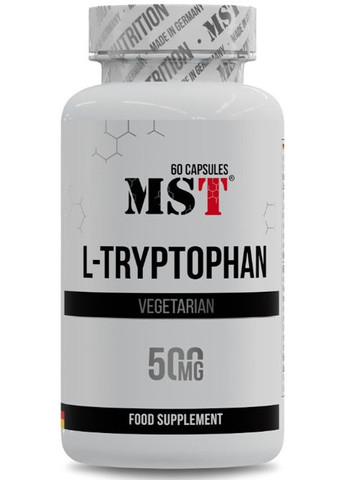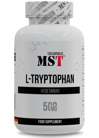 MST® L-Tryptophan 500 mg – незамінна амінокислота для підтримки позитивного настрою, здорового сну і хорошої роботи імунної системи. Триптофан називають природним регулятором настрою. Він діє як нелікарський антидепресант. MST® L-Tryptophan стимулює вивільнення гормону росту, зменшує тягу до солодкого. Амінокислота триптофан може синтезувати в клітинах головного мозку гормон серотонін, який позитивно впливає на психіку людини, дає спокій і гарний настрій. Серотонін також виробляється при вживанні продуктів, багатих цукром і простими вуглеводами. Клінічно доведено, що додатковий прийом L-Tryptophan значно знижує тягу до солодкого за рахунок стимулювання вироблення серотоніну, що є безсумнівним плюсом для людей, що стежать за своєю вагою. Вночі серотонін перетворюється в мелатонін, який забезпечує глибокий і повноцінний сон. При перельотах і зміні часових поясів MST® L-Tryptophan допоможе біоритмам швидше адаптуватися. ПЕРЕВАГИ MST® L-Tryptophan: – сприяє емоційному і душевному комфорту, – допомагає повноцінно виспатись, – натуральність і відсутність побічних ефектів, – випускається у формі веганських капсул, – підходить вегетаріанцям MST® L-Tryptophan сприяє: – синтезу в нічний час мелатоніну, – поліпшенню якості сну, – днем зняттю емоційної напруги, тривожності, – зниженню дратівливості, – підвищенню фізичної та розумової працездатності, – зменшенню апетиту, – зниженню тяги до солодкого, – позбавленню від залежностей (алкогольна, наркотична) разом з основним лікуванням Застосування Приймати 1-2 капсули в день, запиваючи водою (200мл). Застереження: У разі вагітності, годування груддю, прийому медичних препаратів або наявності будь-яких захворювань слід проконсультуватися з лікарем перед вживанням харчових добавок. У разі виникнення побічних реакцій припиніть використання та проконсультуйтеся з лікарем. Зберігати в недоступному для дітей місці. Не використовувати, якщо зовнішня захисна мембрана відсутня або пошкоджена. *** Виробник залишає за собою право змінити зовнішній вигляд упаковки, склад та/або консистенцію продукту. **** БАД не є лікарським засобом!