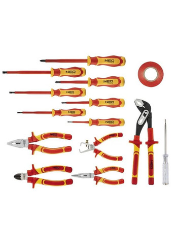 Набір інструменту NEO Tools (13 предметів) шарнірно-губцевого з викрутками Набір інструментів 1000 В NEO містить 13 інструментів. У тому, викрутки та пасатижі. Атестовані для експлуатації під напругою 1000 В. Жала виготовлені з виключно міцної хроммолібденової сталі. Губки пасатижів куті, виготовлені з хромванадієвої сталі. Двокомпонентна, ергономічна ручка додає комфорту під час користування. Надійність продукту підтверджується 25-річною гарантією. Марка NEO відповідає очікуванням професіоналів. Комплектація: Набір інструменту NEO Tools- 1 уп