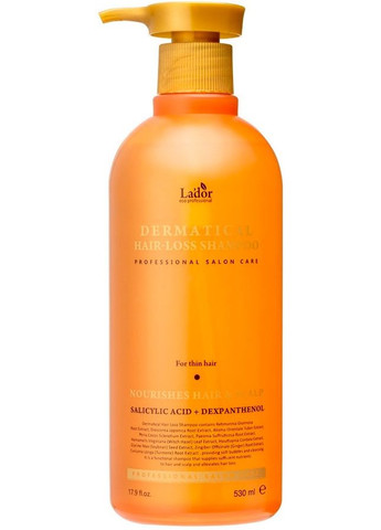 Опис Безсульфатний шампунь проти випадіння волосся - La'dor Dermatical Hair-Loss Shampoo Кожен, хто дбає про здоров'я свого волосся, знає, наскільки важливим є правильний догляд. Але що робити, якщо ваше волосся починає втрачати свою силу і красу, стаючи слабким і тьмяним? Ключ до вирішення цієї проблеми може бути простішим, ніж ви думаєте. Шампунь Dermatical Hair-Loss від бренда La'dor — інноваційне рішення для боротьби з випаданням волосся. Цей безсульфатний шампунь створений спеціально для тих, хто прагне мати не лише гарні, а й здорові локони. Його формула збагачена саліциловою кислотою, яка забезпечує м'яке відлущування шкіри голови, сприяючи глибокому очищенню та усуненню надлишків себуму. Не тільки очищення шкіри голови стоїть на першому місці, а й живлення та зволоження пасм. У складі шампуню є пантенол і унікальний комплекс рослинних екстрактів, які зволожують волосся, роблячи його м'яким і блискучим, а також стимулюють кровообіг, зміцнюючи волосяні цибулини. Ментол додає відчуття свіжості, регулюючи роботу сальних залоз. Подаруйте своєму волоссю життєву силу та блиск з Dermatical Hair-Loss Shampoo від La'dor. Особливості La'dor Dermatical Hair-Loss Shampoo: - містить саліцилову кислоту для м'якого очищення шкіри голови;- збагачений пантенолом для зволоження та пом'якшення волосся;- у складі є комплекс рослинних екстрактів для зміцнення волосяних цибулин;- ментол регулює роботу сальних залоз і забезпечує тривале відчуття свіжості;- безсульфатна формула підходить для всіх типів волосся;- боротьба з випаданням волосся та стимуляція росту нових волосин;- підходить для щоденного використання;- дарує локонам здоров'я та блиск. Спосіб застосування Невелику кількість шампуню налити на долоні і спінити. Нанести піну на мокре волосся, помасажувати та промити теплою водою. За потреби повторити. Склад Water, Decyl Glucoside, Lauryl Glucoside, Sodium Cocoyl Glutamate, Cocodimonium Hydroxypropyl Hydrolyzed Wheat Protein, Sophora Flavescens Root Extract, Capsicum Annuum Extract, Lycium Chinense Fruit Extract, Camellia Sinensis Leaf Extract, Angelica Gigas Root Extract, Angelica Dahurica Root Extract, Rubus Coreanus Fruit Extract, Morus Alba Root Extract, Pinus Palustris Leaf Extract, Lithospermum Officinale Root Extract, Polygonum Multiflorum Root Extract, Menthol, Propylene Glycol, Salicylic Acid, Dexpanthenol, Rosmarinus Officinalis (Rosemary) Leaf Oil, Lavandula Angustifolia (Lavender) Oil, Ocimum Basilicum (Basil) Oil, Salvia Sclarea (Clary) Oil, Pelargonium Graveolens Flower Oil, Citrus Grandis (Grapefruit) Peel Oil, Citrus Limon (Lemon) Peel Oil, Citrus Aurantium Dulcis (Orange) Peel Oil, Citrus Aurantium Bergamia (Bergamot) Fruit Oil, Sodium Hyaluronate, Niacinamide, Citric Acid, 1,2-Hexanediol, Caprylyl Glycol, Polyqternium-10, Disodium EDTA, Limonene
