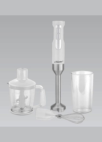 Потужність, Вт 500 Вт Місткість склянки, мл 900 мл Тип Заглибний Комплектація Блендер, стакан, інструкція з експлуатації Джерело живлення Мережа 220 В Матеріал ніжки блендера Пластик Особливості Захист двигуна від перегрівання, турборежим Призначення Для дитячого харчування, для смузі, для сорбету Кількість швидкостей 2 Матеріал чаші / склянки Пластик Колір Сірий, чорний Керування Електронне Матеріал корпуса Пластик Габарити (ВхШхГ) 40 x 6.4 x 5 см Габарити упаковки (ВхШхГ) 41.5 x 10.2 x 10.2 см Блендер Maestro MR-509 — це потужний і надійний пристрій з потужністю 500 Вт, що дозволяє легко та швидко приготувати смузі, дитяче харчування, сорбети та інші страви. Завдяки ножам з нержавіючої сталі, він ідеально справляється з подрібненням навіть найтвердіших продуктів. Цей заглибний блендер має два швидкісних режиму, що дозволяють вибрати оптимальну швидкість для кожного виду продукту. Для швидкого і ефективного змішування є імпульсний режим, що додає зручності у процесі приготування. Блендер комплектується зручним мірним стаканом об'ємом 900 мл, що дозволяє точно вимірювати інгредієнти та працювати без зайвих ускладнень. Матеріал чаші — пластик, що робить її легкою та зручною у використанні. Особливістю блендера Maestro MR-509 є захист двигуна від перегрівання, що забезпечує тривалий термін служби пристрою. Його електронне керування дозволяє з легкістю налаштовувати потрібну швидкість. Колір блендера — стильний сірий і чорний, що підходить до будь-якого інтер'єру. Ідеальний для тих, хто хоче отримати якісну техніку для своєї кухні.