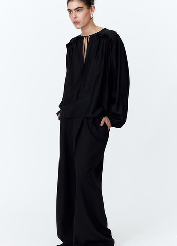 Укорочена блузка з віскозної тканини. Вільний крій із відкладним коміром, ґудзиками спереду, заниженою лінією плеча та короткими рукавами. Довжина виробу на розмір XXS: 40 см, окружність грудей: 96 см; на розмір XS: 40 см, окружність грудей: 98 см; на розмір M: 41 см, окружність грудей: 106 см; на розмір L: 42 см, окружність грудей: 110 см.