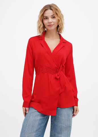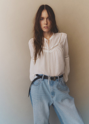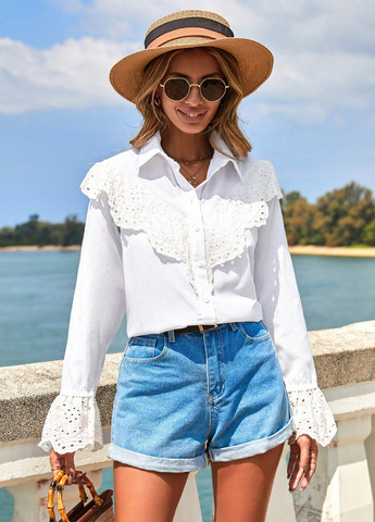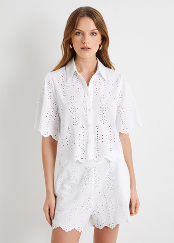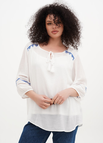 Блуза з вишивкою "Рішельє" однотонна, підкладка - майка, що пристьогується, застібка на гудзик, круглий виріз горловини, 3/4 рукав.
