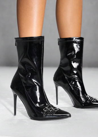 Жіночі чорні демісезонні ботильйони - елегантне взуття, що поєднує стиль і комфорт. Верх виконаний зі штучної шкіри, яка надає виробу м'якості та розкішного вигляду. Стійкий підбор 6 см додає взуттю вишуканості.