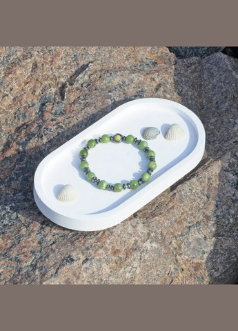 Браслет на гумці Котяче Око зелене (синт) та натуральний Канадський Жадеїт +вставки колір срібло, фурнітура гіпоалергенний сплав d-10х8мм+- L-18см
